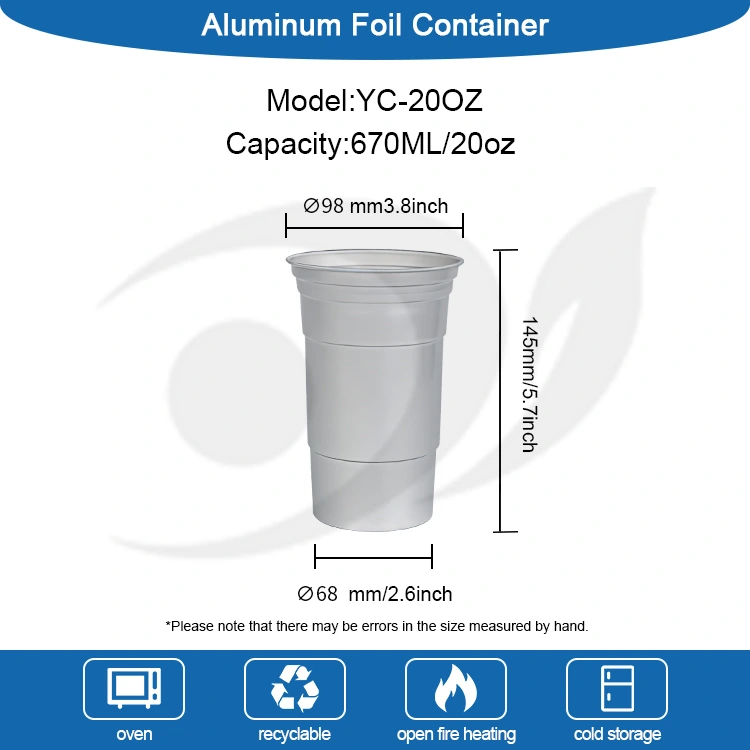 YUNCHU ເປັນຜູ້ຜະລິດຈອກເຄື່ອງດື່ມອາລູມິນຽມງ່າຍດາຍ 20oz ທີ່ມີຄຸນນະພາບຂອງຈີນ. ນີ້ແມ່ນຖ້ວຍອະລູມິນຽມທີ່ມີປະໂຫຍດຫຼາຍ 20oz Disposable Aluminum Cup Drinking Cup ທີ່ເຮັດດ້ວຍແຜ່ນອາລູມິນຽມຊັ້ນອາຫານໃນຊິ້ນດຽວ. ມັນມີນ້ຳໜັກເບົາ, ທົນທານ, ແລະການນຳກັບມາໃຊ້ໃໝ່ໄດ້ 100%. ການນໍາຄວາມຮ້ອນທີ່ດີເລີດຂອງມັນເຮັດໃຫ້ມັນເຫມາະສົມສໍາລັບທັງເຄື່ອງດື່ມເຢັນແລະຮ້ອນ. ຝາປິດປະທັບຕາສາມາດປ້ອງກັນການຮົ່ວໄຫຼໄດ້ຢ່າງມີປະສິດທິພາບ. ຈອກເຄື່ອງດື່ມອະລູມີນຽມທີ່ປັບແຕ່ງໄດ້ 20oz ນີ້ຍັງເຫມາະສົມສໍາລັບສະຖານະການຕ່າງໆເຊັ່ນ: ການເອົາກາເຟ, ການຕັ້ງແຄ້ມກາງແຈ້ງ, ແລະງານລ້ຽງ, ແລະໃຫ້ບໍລິການປັບແຕ່ງສີ, ໂລໂກ້, ແລະແມ່ພິມ.