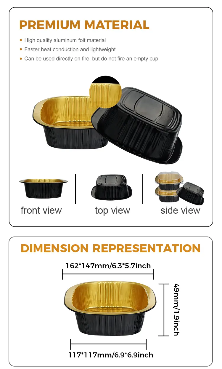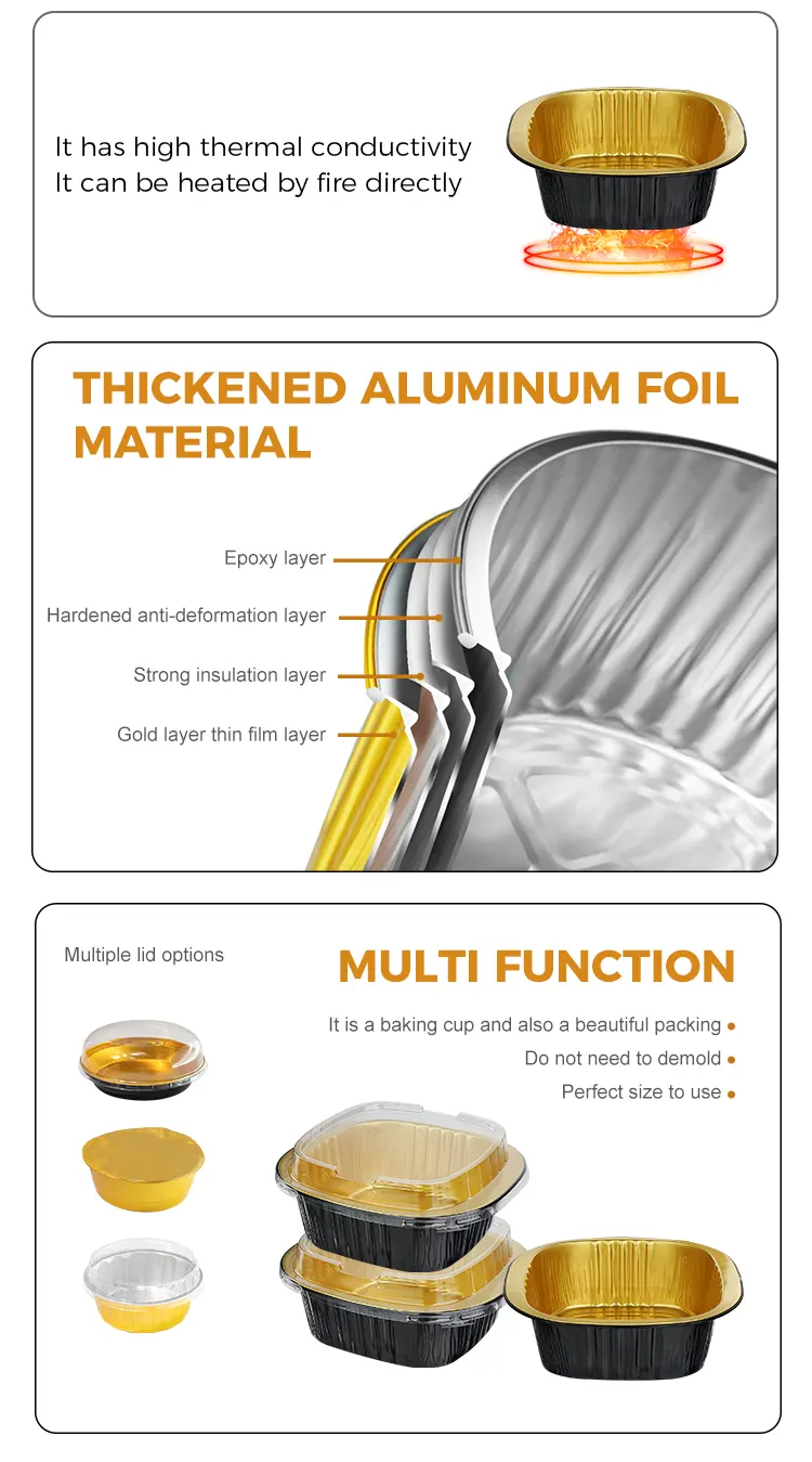Yunchu Aluminum Foil Supplier's disposable double-ear square box black gold light-walled aluminium foil container containers a square shape, ການນໍາໃຊ້ພື້ນທີ່ຢ່າງເຕັມທີ່, ມຸມມົນແລະກ້ຽງ, ບໍ່ມີ burrs ແຫຼມ, ແລະປອດໄພກວ່າໃນການນໍາໃຊ້; ການອອກແບບຫູສອງຢ່າງທີ່ຄິດ, ergonomic, insulated ແລະຕ້ານການ scalding, ງ່າຍທີ່ຈະເອົາ, ເຖິງແມ່ນວ່າມັນມີອາຫານຮ້ອນແລະແກງ, ມັນສາມາດຖືໄດ້ຢ່າງງ່າຍດາຍເພື່ອຫຼີກເວັ້ນການບາດແຜມືແລະແກ້ໄຂຈຸດເຈັບປວດທີ່ບໍ່ສະດວກຂອງກ່ອງແຜ່ນອາລູມິນຽມແບບດັ້ງເດີມ. ເຮັດດ້ວຍແຜ່ນອາລູມິນຽມທີ່ຫນາແຫນ້ນ, ມັນມີໂຄງສ້າງແຂງແລະທົນທານ, ຄວາມສາມາດໃນການສະຫນັບສະຫນູນທີ່ເຂັ້ມແຂງ, ແລະບໍ່ຖືກທໍາລາຍໄດ້ງ່າຍ. ມັນສາມາດຖືອາຫານດ້ວຍແກງແລະໄຂມັນໂດຍບໍ່ມີບັນຫາການຮົ່ວໄຫຼຫຼືຂ້າງຄຽງ, ແລະຄວາມທົນທານຂອງມັນແມ່ນເຫນືອກວ່າກ່ອງອາຫານທ່ຽງແບບທໍາມະດາທີ່ໃຊ້ແລ້ວ.
