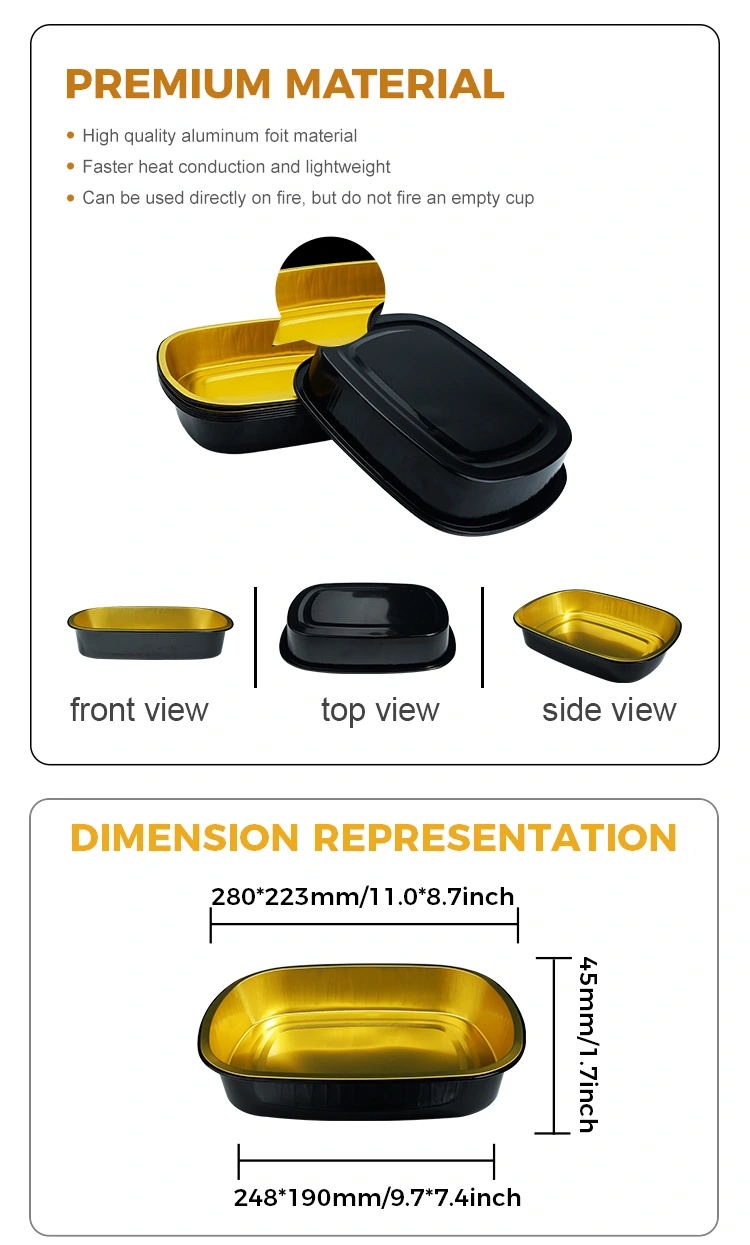 ບັນຈຸເຄື່ອງບັນຈຸຜ້າປູພື້ນຄໍາຂອງ Yunchu Alumberum ທີ່ກໍາຈັດແມ່ນເຫມາະສໍາລັບຫລາຍຄົນຫຼືສະຖານະການຮັບປະທານອາຫານດ້ວຍຕົນເອງໂດຍສະເພາະແມ່ນສໍາລັບການຫຸ້ມຫໍ່ຂອງຖ້ວຍຫລື pasta ອົບ. ຜະລິດຕະພັນນີ້ແມ່ນຍັງເຫມາະສົມສໍາລັບການຫຸ້ມຫໍ່ຫ້ອງອາຫານທ່ຽງ, ການຮັບອາຫານແລະເຮືອນພັກ, ພ້ອມທັງການຫຸ້ມຫໍ່ທີ່ເລືອກໄວ້. ພາຊະນະແມ່ນເຮັດດ້ວຍແຜ່ນອະລູມິນຽມທີ່ມີຄຸນນະພາບສູງ, ເຊິ່ງປອດໄພແລະບໍ່ມີກິ່ນແລະບໍ່ມີມາດຕະຖານຕິດຕໍ່ອາຫານສາກົນ. ເມື່ອປະສົມປະສານກັບຮູບເງົາເລື່ອງຄວາມຮ້ອນ, ມັນສາມາດບັນລຸການຜະນຶກທີ່ມີປະສິດທິພາບແລະປ້ອງກັນການຮົ່ວໄຫຼຂອງແກງ, ເຮັດໃຫ້ມັນເຫມາະສໍາລັບອຸປະກອນປະທັບຕາອັດຕະໂນມັດ. ຕູ້ຄອນເທນເນີມີພື້ນຜິວທີ່ລຽບແລະຮາບພຽງເພື່ອຕິດປ້າຍງ່າຍແລະຮູບຊົງທີ່ສວຍງາມເຊິ່ງຊ່ວຍເສີມຂະຫຍາຍຮູບພາບຍີ່ຫໍ້. ມັນທົນທານຕໍ່ກັບອຸນຫະພູມສູງແລະຕ່ໍາ, ສາມາດນໍາໃຊ້ໃນລະດັບອຸນຫະພູມຂອງ -20 ° C ເຖິງ 250 ° C, ແລະສະຫນັບສະຫນູນວິທີການເຮັດຄວາມຮ້ອນຕ່າງໆເຊັ່ນ: ການອົບອຸ່ນ, ແລະຫນື້ງ. ອຸປະກອນການວັດຖຸດິບອາລູມິນຽມແມ່ນສາມາດນໍາໃຊ້ໄດ້ 100% ແລະຕອບສະຫນອງຄວາມຕ້ອງການຂອງການພັດທະນາແບບຍືນຍົງ.