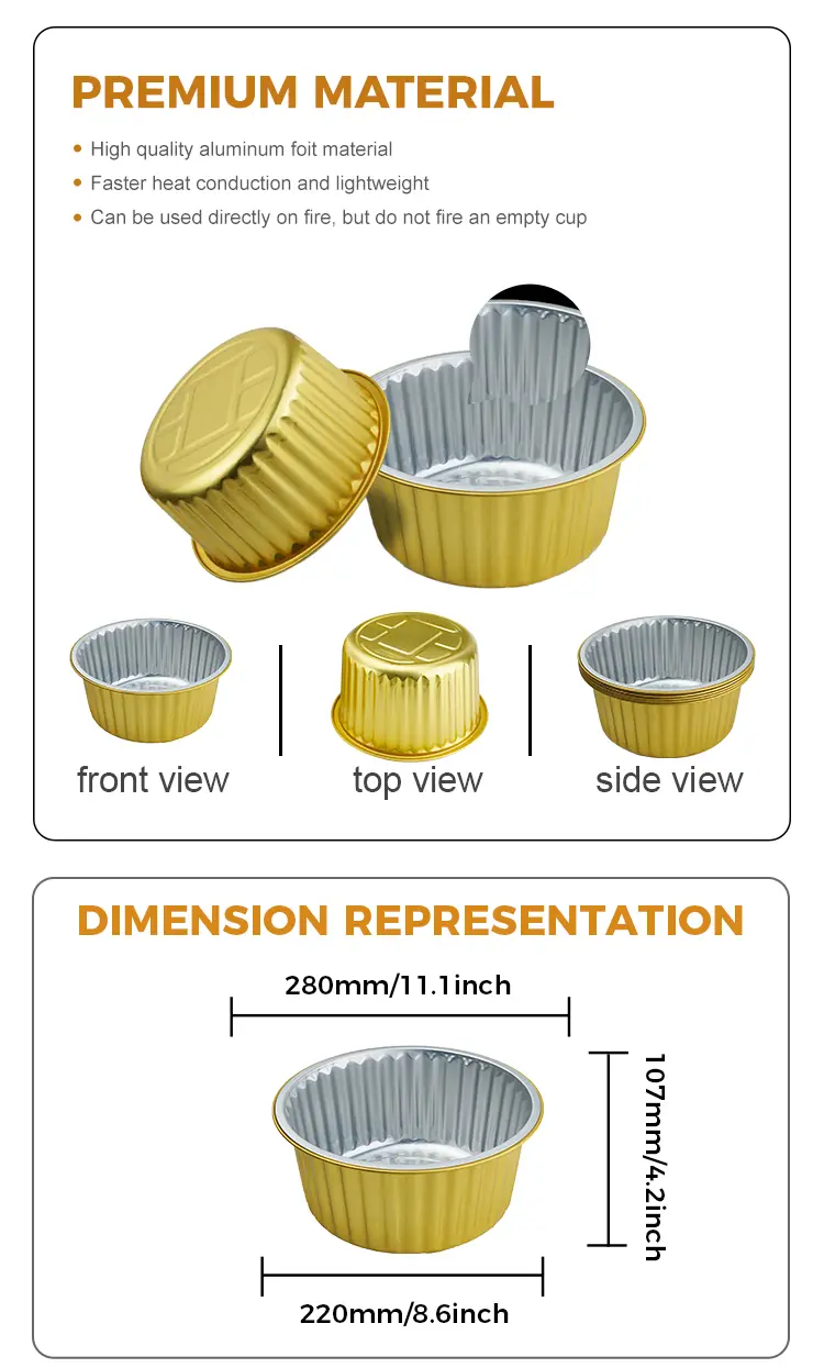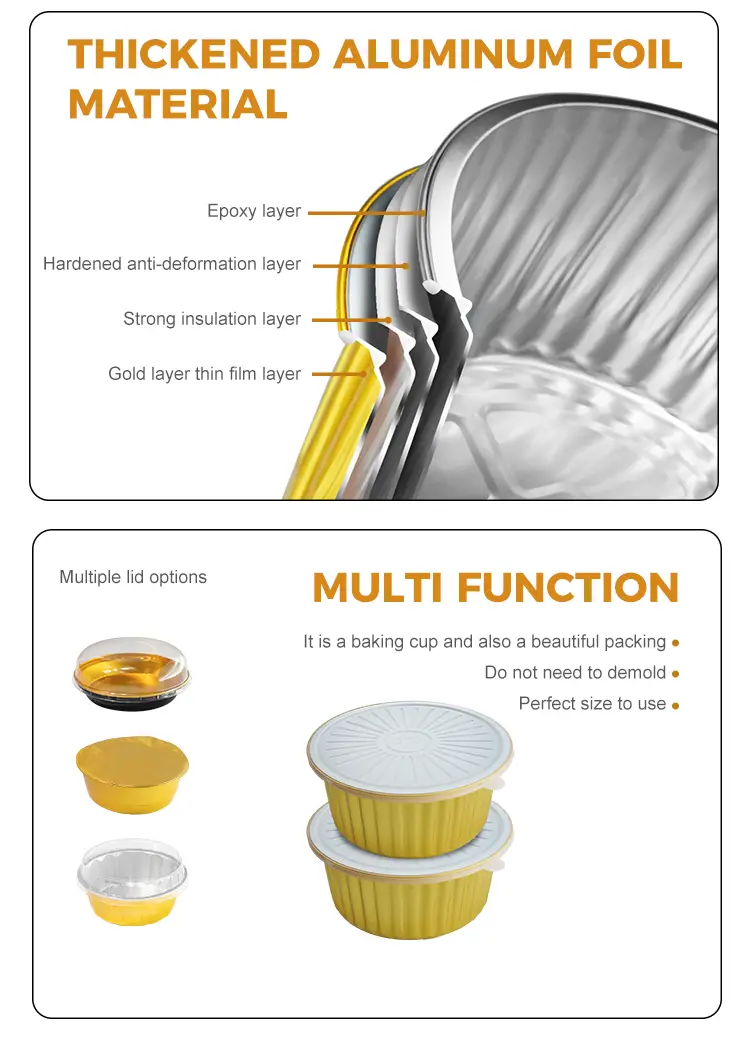 ເຄື່ອງຍົກຂອງອາລູມີນຽມ, ແລະການສະຫນອງອາຫານທີ່ກຽມໄວ້ໃນອາລູມິນຽມ, ແລະການສະຫນອງເຄື່ອງປະດັບ ກິດຈະກໍາສ້າງອາຫານການກິນ, ແລະອື່ນໆ. ອຸປະກອນການອະນຸຍາດໃຫ້ມີການແຈກຢາຍຄວາມຮ້ອນ, ຄວາມຮ້ອນທີ່ດີ, ບໍ່ມີການເຜົາຜານ, ບໍ່ມີການເຮັດຄວາມສະອາດ, ບໍ່ມີຄວາມສະອາດ, ບໍ່ມີຄວາມສະອາດ, ບໍ່ມີຄວາມສະອາດ, ບໍ່ມີຄວາມສະອາດ, ບໍ່ຄວນເຮັດຄວາມສະອາດ, ແຄມກ້ຽງບໍ່ໄດ້ທໍາຮ້າຍມືຂອງທ່ານ, ຮັບປະກັນວ່າອາຫານທີ່ກຽມໄວ້ແມ່ນໄດ້ຖືກປຸງແຕ່ງຢ່າງເຕັມສ່ວນ; ແຊ່ foil ແມ່ນສໍາເລັດໃນສີຄໍາທີ່ສະຫງ່າງາມທີ່ຊ່ວຍເພີ່ມການນໍາສະເຫນີແລະໃຫ້ສົມບູນໃນເຮືອນຄົວຫຼືdécorກິດຈະກໍາຂອງທ່ານ.