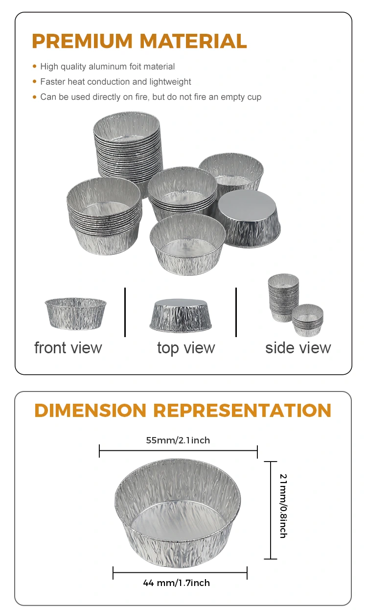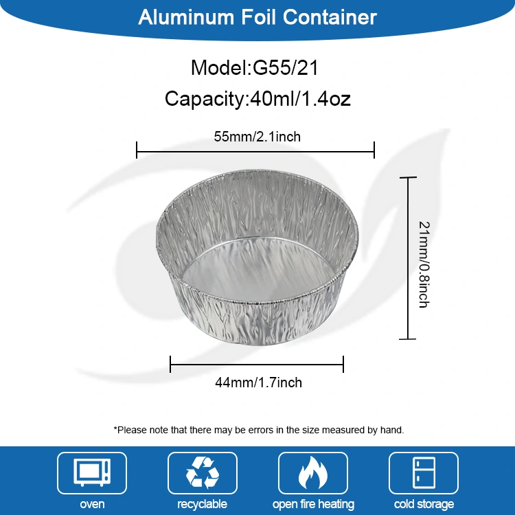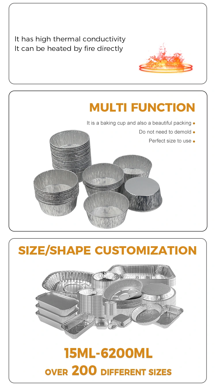 Yunchu Aluminum Foil Supplier's disposable silver round dipping air fryer containers silver aluminium foil containers ແມ່ນເຮັດຈາກ foil ອາລູມິນຽມຫນາຂອງອາຫານເກຣດ. ມັນປອດໄພ, ບໍ່ມີກິ່ນ, ແລະບໍ່ມີຝົນທີ່ເປັນອັນຕະລາຍ. ມັນສາມາດຕິດຕໍ່ໂດຍກົງກັບອຸປະກອນການ dipping ທຸກປະເພດ. ກ່ອງບັນຈຸແຜ່ນອາລູມິນຽມຂະຫນາດນ້ອຍນີ້ສາມາດ stacked ເພື່ອປະຫຍັດພື້ນທີ່, ບໍ່ຜິດປົກກະຕິ, ແລະບໍ່ຮົ່ວໄຫຼ. ແຜ່ນອາລູມິນຽມເງິນມີໂຄງສ້າງທີ່ເປັນເອກະພາບແລະການນໍາຄວາມຮ້ອນທີ່ດີເລີດ. ມັນສາມາດຖືກນໍາໃຊ້ໃນຮ້ານອາຫານ, ຮ້ານກາເຟ, ການຊຸມນຸມຄອບຄົວ, ແລະອື່ນໆ, ມັນຖືກນໍາໃຊ້ກັບອາຫານຫວ່າງໃນເຕົາອົບອາກາດ, ແລະອື່ນໆ, ເຖິງແມ່ນວ່າມັນມີນ້ໍາຊອດຫນາແລະນ້ໍາຈືດ, ມັນຈະບໍ່ຮົ່ວໄຫຼ. ມັນຮັກສາໂຕະໂຕະ ແລະເຄື່ອງໃຊ້ໃນເຮືອນຄົວໃຫ້ສະອາດ ແລະເປັນລະບຽບ. ການນໍາສະເຫນີຂອງ foil ແມ່ນງ່າຍດາຍແລະສວຍງາມໃນ scenes ຕ່າງໆ. ຮູບລັກສະນະເງິນສາມາດຖືກຈັບຄູ່ກັບຖ້ວຍຄ່ໍາຕ່າງໆ.