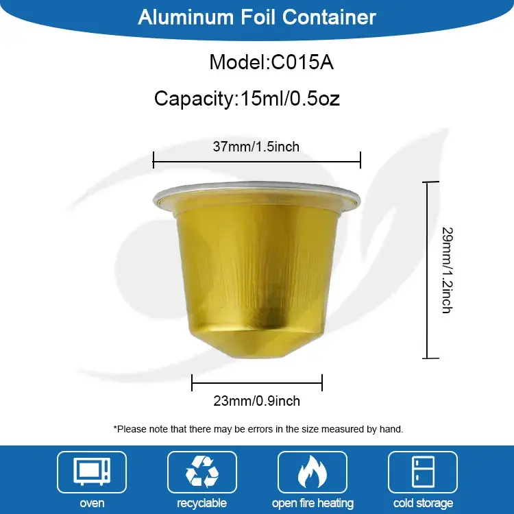 ເສັ້ນຜ່າສູນກາງທີ່ມີຂະຫນາດປະມານ 67 ນີ້ວ (ປະມານ 1,9 ນີ້ວ (ປະມານ 0.9 ນີ້ວ), ມີຄວາມສູງ 28 ມມ (ປະມານ 1.1 ນີ້ວ). ແຄບຊູນນີ້ຖື 15 ml (ປະມານ 0.5 ອໍ) ຂອງກາເຟ, ທາດກາເຟ. ເຫມາະສໍາລັບເຄື່ອງຈັກ Nespresso ທຸກຢ່າງ, ທາດແຫຼວ espresso ຫຸ້ມຫໍ່, ແລະຍັງສາມາດຂະຫຍາຍໄດ້ດ້ວຍການລ້າງ nitrogen. ນອກຈາກນັ້ນ, ໂລໂກ້ແລະສີກໍ່ຍັງສາມາດປັບແຕ່ງໄດ້, ແລະຮູບແບບສາມາດຖືກພິມໃສ່ຝາປິດອາລູມີນຽມ, ແລະໂລໂກ້ຍັງສາມາດຕິດຢູ່ເທິງລຸ່ມຂອງແຄບຊູນກາເຟ.